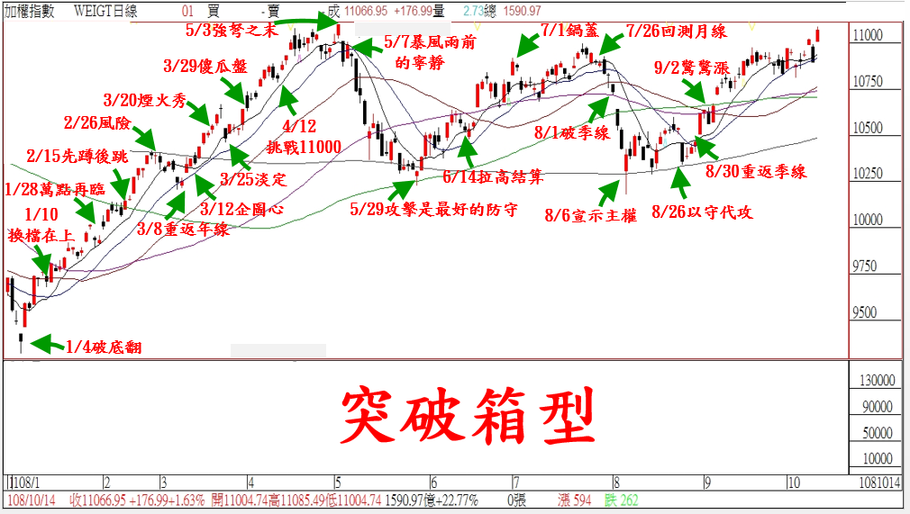 上週我們才說…『雙十連假』基本上台股短線的震盪都是反應『消息面』變化。這週一開始中美貿易戰的消息轉好,全球股市立即出現大漲的走勢,所以消息面目前還是左右全球股市的重點,但投資朋友也會被此種『消息面』帶動的上沖下洗走勢搞得一個頭兩個大;觀察今日三大法人全部買超+198億的情況下,許多人認為台股已『突破箱型』,但武傑認為應該還是要再多觀察,指數的部分我們就不隨之起舞,武傑會持續幫大家找出有基本面為護城河的優質個股,幫大家繼續賺!