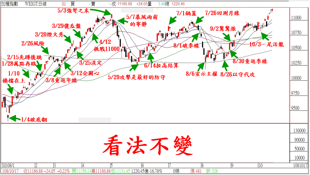國際股市漲多休息下,台股早盤小跌-6點開出,在台積電的壓抑下,指數全場就平盤下遊走;尾盤在鴻家軍的拉抬下,終場小漲+24點作收,收在11186點,成交量1220億。