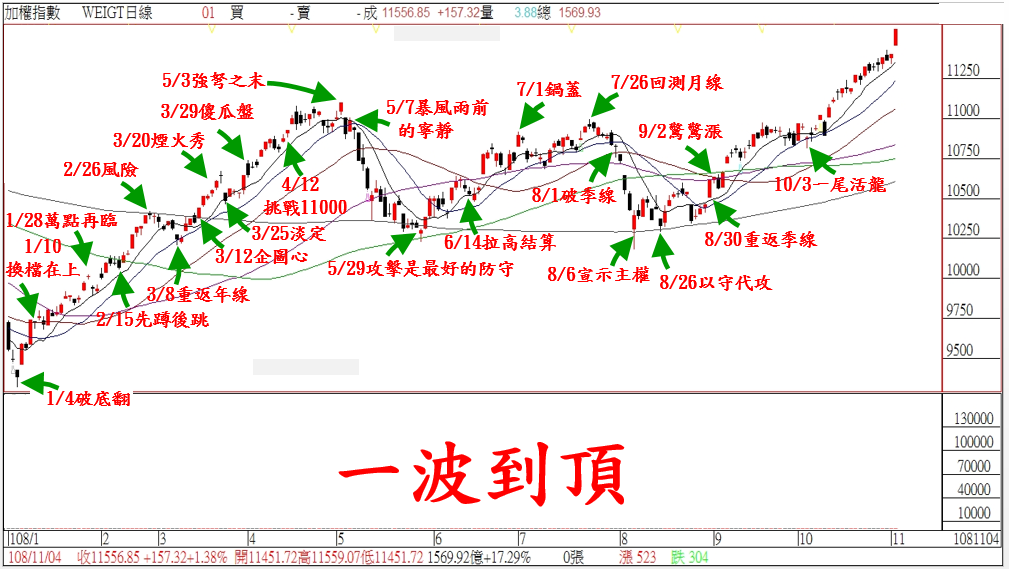 結束上星期籌碼壓抑後,今天在『全面啟動』下,終場台股大漲+157點,再度改寫波段新高。有別於過去二周『盤堅』,今天台積電和鴻海的『雙龍出海』下,指數的表現明顯放大。上星期『關鍵轉折』已結束,本周內資買盤也如預期開始擴散;整體結構就沒有太多分析空間,多方依舊還是震盪走高。接下來就是留意中、小型股的補漲行情,選前行情欲小不易,投資朋友把握這『一波到頂』的行情。