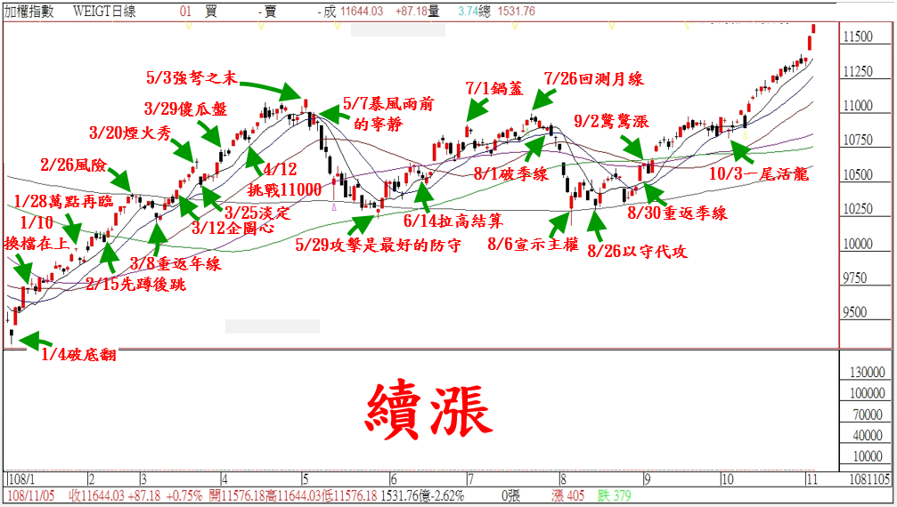 選前行情欲小不易,投資朋友把握這『一波到頂』的行情;今天在『買盤擴散』下,加權指數再度改寫波段新高。今天三大法人再度同部大買+170億,整體的籌碼結構並沒有什麼太大變化。只是對於盤勢大漲,不少投資朋友會問:『這個行情要漲那裡?』。基本上從技術面來看,指數下一個關卡就是歷史高點12682點,所以從技術面去推算高點的意義不大;另外台幣匯率再創高,顯示國際資金持續流入台灣。所以目前台股是一個行進間換手姿態,在短線沒有爆大量前,都不要去預估指數的高點。