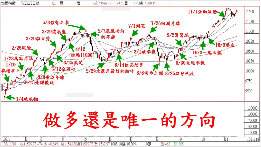 一周的開始,台北股市今天先拉高+74點;對這星期的台指期結算,算是先馳得點。對於這禮拜的台股盤勢,武傑在上星期已經說過;基本上就沒有什麼改變。本周的觀盤重點,依舊在於內資買盤的回流,今年高點11668,可望再來挑戰。不過,今天值得關注的一點,就是台股在量縮不足1100億下;尾盤依然可然上漲+74點,顯示台股目前賣盤壓力已經沒什麼力量。所以展望本周台股『作多還是唯一的方向』,短線的差異就是急漲和緩漲,投資朋友保持多方操作即可。