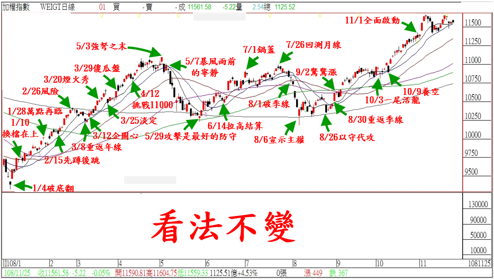 基本上台股盤勢分析得空間並不大,市場還是呈現比較觀望態勢;不過,整體來看還是有利多方。延續上週的分析預估上半周盤勢壓力還會比較大,基本上是個『先蹲後跳』的架構。而今天的拉回修正武傑認為只是技術面遇到壓力的小幅整理,預計多頭上攻的時間會落在下半週,如果有利多消息,殼能隨時會再次發動攻勢,所以大家要緊跟盤中的訊息,好好把握年底最後的獲利時機。