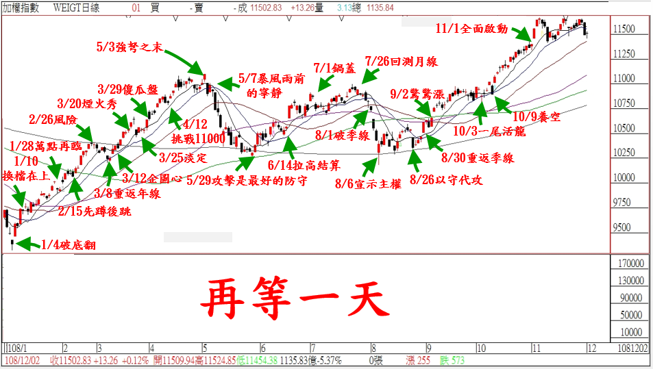 12月的第一個交易日,台北股市紅盤小漲+20點開出,隨後加權指數震盪走低,翻黑下跌-35點;10點後又開始拉抬,一路再平盤附近震盪,尾盤小幅拉抬,終場台股上漲+13點作收,收在11502點,成交量1133億。