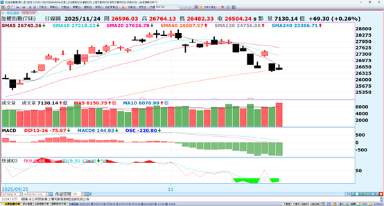 台股技術面目前MACD翻綠15個交易日,今天台股加權指數在美股反彈下是高盤開出,盤中高檔震盪為主,尾盤MSCI調整權重下有些波動,台股終場收盤上漲69.3點,收在26504.24點,成交量為7130.14億。今上市櫃股票合計上漲家數701家、下跌488家,漲停家數26家。