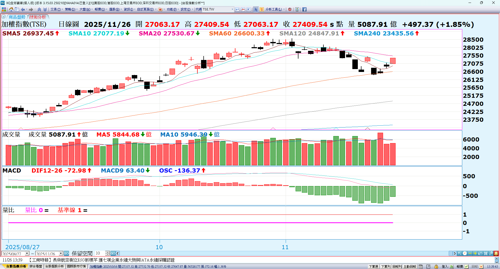 美股四大指數近兩日皆站回季線之上,台股也順勢強彈反應,和季線距離更拉開了,目前剩下上面的月線還未過,經過11月份行情大刷洗,12月份將會有不同的面貌。